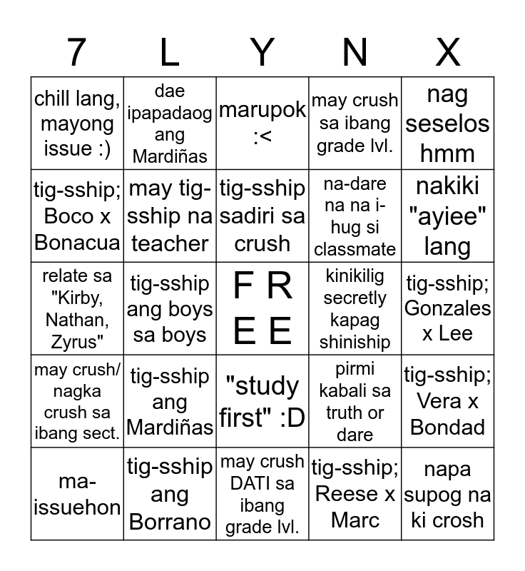 This bingo card has a free space and 24 words: tig-sship ang Mardiñas, tig-sship ang Borrano, tig-sship sadiri sa crush, ma-issuehon, nag seselos hmm, chill lang, mayong issue :), tig-sship; Boco x Bonacua, dae ipapadaog ang Mardiñas, kinikilig secretly kapag shiniship, "study first" :D, na-dare na na i-hug si classmate, relate sa "Kirby, Nathan, Zyrus", pirmi kabali sa truth or dare, tig-sship; Vera x Bondad, may tig-sship na teacher, tig-sship; Reese x Marc, tig-sship; Gonzales x Lee, marupok :<, nakiki "ayiee" lang, tig-sship ang boys sa boys, napa supog na ki crosh, may crush/ nagka crush sa ibang sect., may crush sa ibang grade lvl. and may crush DATI sa ibang grade lvl..