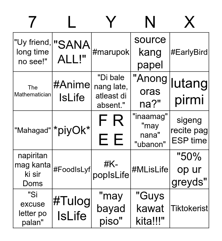 This bingo card has a free space and 24 words: #FoodIsLyf, #Tulog IsLife, "Di bale nang late, atleast di absent.", "Si excuse letter po palan", #EarlyBird, "Uy friend, long time no see!", The Mathematician, "SANA ALL!", "inaamag" "may nana" "ubanon", #K-popIsLife, "Anong oras na?", "Mahagad", #MLisLife, "50% op ur greyds", #Anime IsLife, "Guys kawat kita!!!", sigeng recite pag ESP time, #marupok, lutang pirmi, *piyOk*, Tiktokerist, napiritan mag kanta ki sir Doms, source kang papel and "may bayad piso".