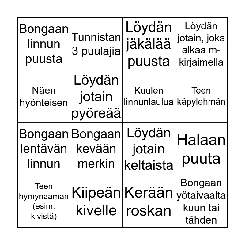 This bingo card has 16 words: Kiipeän kivelle, Halaan puuta, Löydän jäkälää puusta, Bongaan linnun puusta, Bongaan lentävän linnun, Tunnistan 3 puulajia, Löydän jotain keltaista, Kerään roskan, Näen hyönteisen, Löydän jotain pyöreää, Teen hymynaaman (esim. kivistä), Löydän jotain, joka alkaa m-kirjaimella, Bongaan kevään merkin, Teen käpylehmän, Kuulen linnunlaulua and Bongaan yötaivaalta kuun tai tähden.