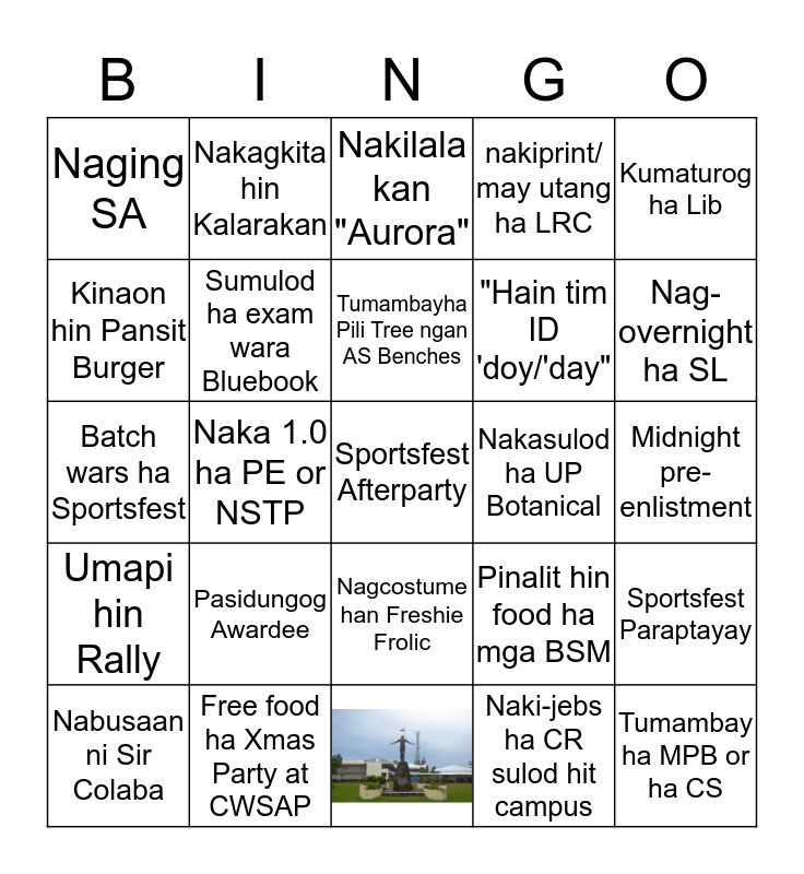 This bingo card has 1 images and 24 words: Umapi hin Rally, Free food ha Xmas Party at CWSAP, Sportsfest Afterparty, Naki-jebs ha CR sulod hit campus, Kumaturog ha Lib, Naging SA, Nakagkita hin Kalarakan, Nakilala kan "Aurora", Nakasulod ha UP Botanical, Sportsfest Paraptayay, Kinaon hin Pansit Burger, Sumulod ha exam wara Bluebook, Pinalit hin food ha mga BSM, Nag-overnight ha SL, Nabusaan ni Sir Colaba, Naka 1.0 ha PE or NSTP, Tumambayha Pili Tree ngan AS Benches, "Hain tim ID 'doy/'day", Midnight pre-enlistment, Batch wars ha Sportsfest, Pasidungog Awardee, Nagcostume han Freshie Frolic, nakiprint/ may utang ha LRC and Tumambay ha MPB or ha CS.