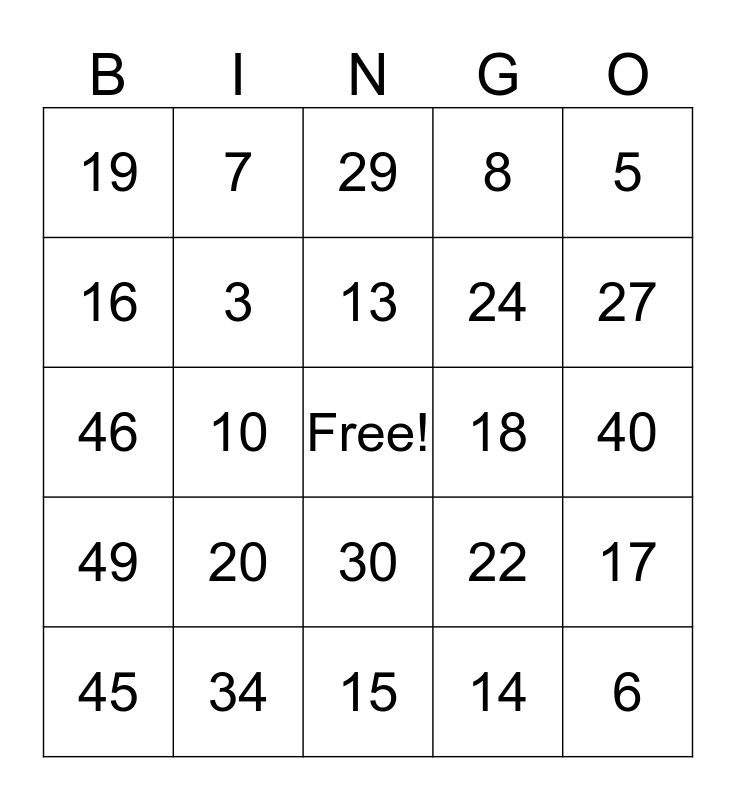 This bingo card has a free space and 50 words: 1, 6, 11, 15, 20, 2, 7, 12, 16, 21, 3, 8, 17, 22, 4, 9, 13, 18, 23, 5, 10, 14, 19, 24, 25, 26, 27, 28, 29, 30, 31, 32, 33, 35, 34, 42, 36, 38, 39, 40, 41, 36, 43, 44, 45, 46, 47, 48, 49 and 50.