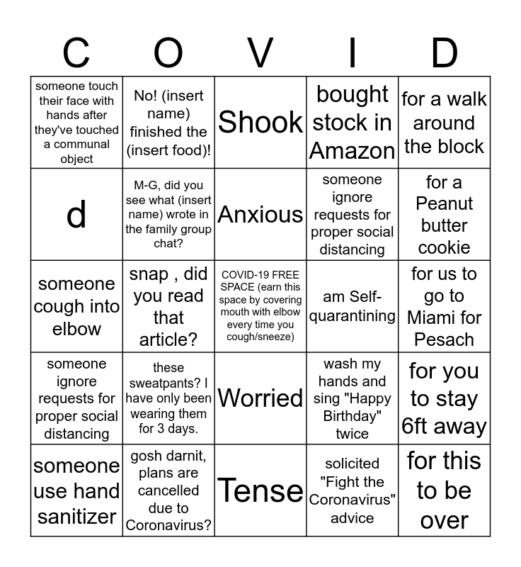 This bingo card has a free space and 40 words: someone wearing a facemask, snap , did you read that article?, Annoyed, wash my hands and sing "Happy Birthday" twice, for this to be over, someone use hand sanitizer, M-G, did you see what (insert name) wrote in the family group chat?, Bored, am Self-quarantining, for us to go to Miami for Pesach, someone cough into elbow, No! (insert name) finished the (insert food)!, have used Zoom, for a Peanut butter cookie, someone ignore requests for proper social distancing, these sweatpants? I have only been wearing them for 3 days., Worried, bought stock in Amazon, for a game of settlers, someone touch their face with hands after they've touched a communal object, gosh darnit, plans are cancelled due to Coronavirus?, Anxious, solicited "Fight the Coronavirus" advice, for a walk around the block, someone drinking bleach to cure Corona, sh*t, I forgot that in my apartment!, Tense, have gained at least 10 pounds, for the pool to open, a fellow Teanecker walking, f course, (insert name) stole my charger!, Shook, have binge-watched a whole series, for you to stay 6ft away, d, someone wearing a facemask, someone use hand sanitizer, someone cough into elbow, someone ignore requests for proper social distancing and someone touch their face with hands after they've touched a communal object.