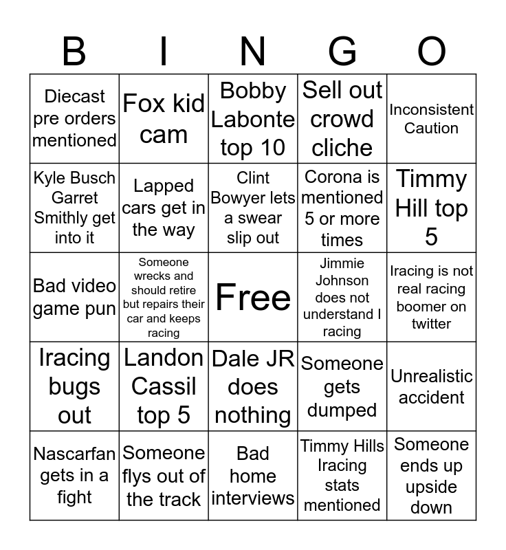 This bingo card has a free space and 28 words: Unrealistic accident, "Ultra realistic simulator", Corona is mentioned 5 or more times, Timmy Hills Iracing stats mentioned, Kyle Busch Garret Smithly get into it, Bobby Labonte top 10, Fox kid cam, Iracing bugs out, Jimmie Johnson does not understand I racing, Nascarfan gets in a fight, Bad video game pun, Sell out crowd cliche, Someone flys out of the track, Bad home interviews, Timmy Hill top 5, ON A COMPUTER, Landon Cassil top 5, Lapped cars get in the way, Clint Bowyer lets a swear slip out, Dale JR does nothing, Diecast pre orders mentioned, Speeding penalty, Someone ends up upside down, Someone wrecks and should retire but repairs their car and keeps racing, Iracing is not real racing boomer on twitter, Someone gets dumped, Inconsistent Caution and Nascar heat 4 is not mentioned.