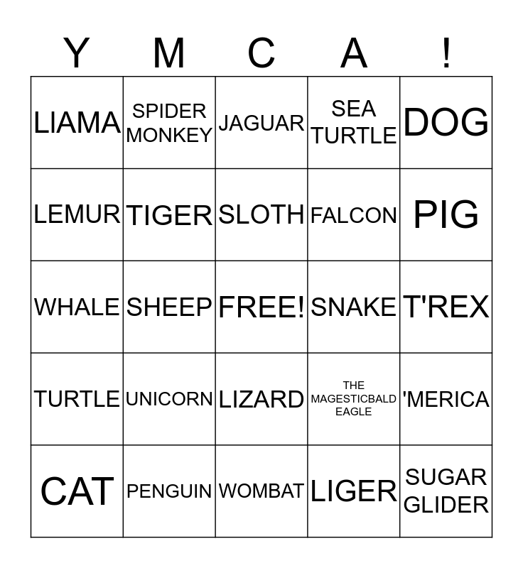 This bingo card has a free space and 24 words: UNICORN, PENGUIN, SLOTH, CAT, DOG, LlAMA, LEMUR, SPIDER MONKEY, SNAKE, LIZARD, FALCON, WHALE, THE MAGESTICBALD EAGLE, 'MERICA, TIGER, LIGER, T'REX, JAGUAR, PIG, SHEEP, SUGAR GLIDER, TURTLE, SEA TURTLE and WOMBAT.
