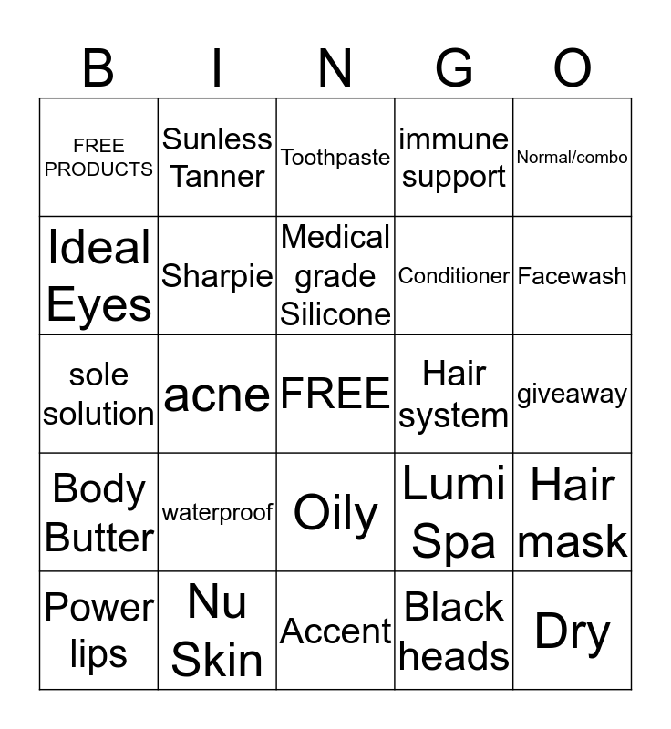 This bingo card has a free space and 27 words: Lumi Spa, Shampoo, Conditioner, Accent, Ideal Eyes, Toothpaste, Sunless Tanner, Body Butter, Hair system, Hair mask, sole solution, immune support, Power lips, Nu Skin, Facewash, My team, Sharpie, Medical grade Silicone, waterproof, FREE PRODUCTS, giveaway, Black heads, acne, Dry, Oily, Normal/combo and antibacterial.