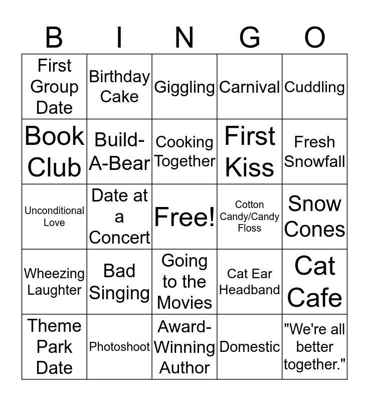This bingo card has a free space and 50 words: "Quick! Kiss me.", "We're all better together.", All The Pillows, Award-Winning Author, Bad Singing, Baking Cookies, Birthday Cake, Blanket Fort, Book Club, Breakfast in Bed, Build-A-Bear, Carnival, Cat Cafe, Cat Ear Headband, Caught in the Rain, Coloring Books, Cooking Together, Cotton Candy/Candy Floss, Craft Fair, Cuddling, Date at a Concert, Domestic, First Group Date, First Kiss, Flower Crowns, Fresh Sheets, Fresh Snowfall, Getting Together, Giggling, Going to the Movies, Group Hugs, Hair Petting, Halloween Competition w/ Neighbors, Lost in Your Eyes, Photoshoot, Prom Night, Puppy Pile, Relaxing in the Bath, Singing Competition, Snow Cones, Snowball Fight, Spa Day, Spinning Hug, Superstitious, Theme Park Date, Unconditional Love, Unicorns, Watching Scary Movies, Wheezing Laughter and Work from Home.