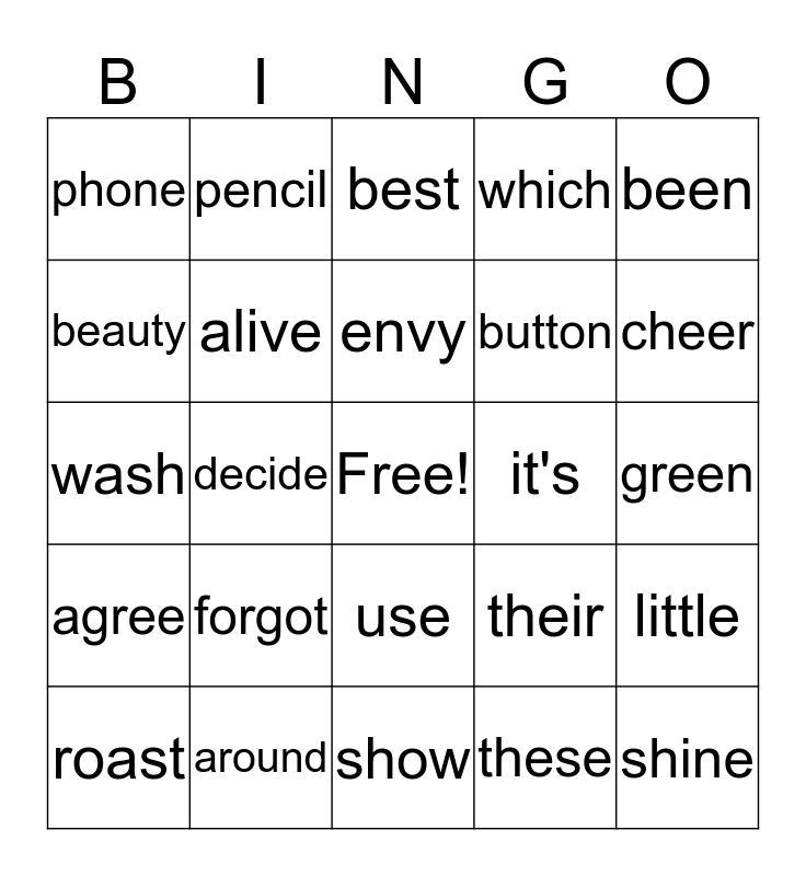 This bingo card has a free space and 34 words: gave, these, those, false, agree, alive, been, roast, pencil, very, envy, best, comb, animal, it's, cheer, around, wash, forgot, their, use, either, phone, green, show, shine, which, because, button, beauty, handsome, decide, little and January.
