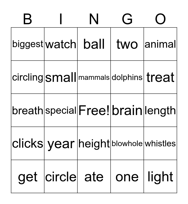 This bingo card has a free space and 24 words: year, circle, mammals, get, animal, biggest, circling, watch, brain, height, dolphins, breath, blowhole, whistles, small, one, length, ball, treat, special, light, clicks, two and ate.