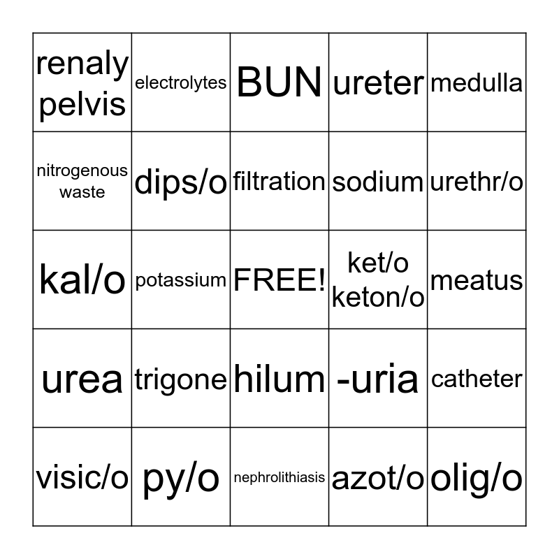 This bingo card has a free space and 64 words: arterioles, Bowman capsule, caly,/calix, catheter, cortex, creatinine, electrolytes, erythropoietin, filtration, glomerulus, hilum, kidney, meatus, medulla, nephron, nitrogenous waste, potassium, renaly pelvis, renin, sodium, trigone, urea, ureter, urethra, uric acid, urinary bladder, urine, urination/voiding, cyst/o, nephr/o, pyel/o, ren/o, trigon/o, ureter/o, urethr/o, visic/o, albumin/o, azot/o, bacteri/o, dips/o, kal/o, ket/o keton/o, lith/o, natr/o, noct/i, olig/o, py/o, -tripsy, -uria, bladder cancer, glomerulonephritis, interstitial nephritis, nephrolithiasis, polycystic kidney, pyelonephritis, renal failure, BUN, ESWL, IVP, ARF, CKD, ESRD, UA and UTI.