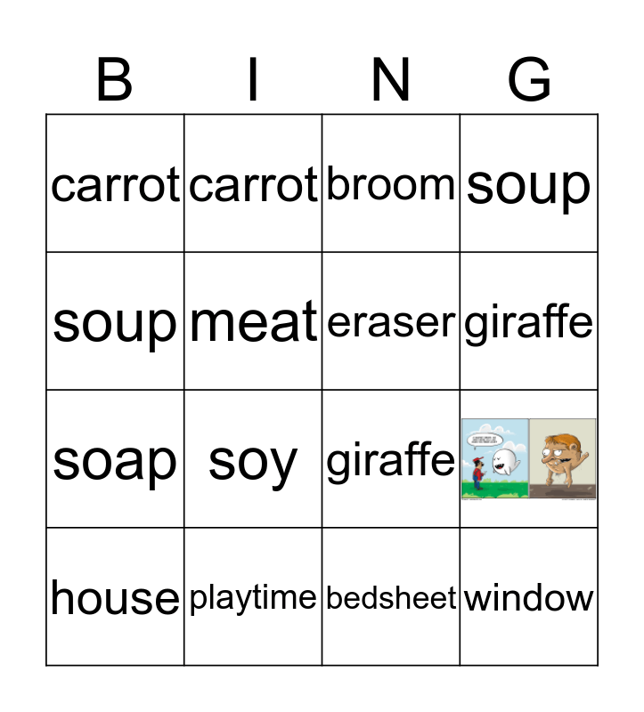 This bingo card has 1 images and 31 words: soy, meat, soap, window, eraser, soup, bedsheet, carrot, Spain, giraffe, broom, shorts, house, playtime, book, eraser, giraffe, book, Spain, shorts, playtime, bedsheet, window, house, soup, soap, meat, carrot, broom, coin and soy.