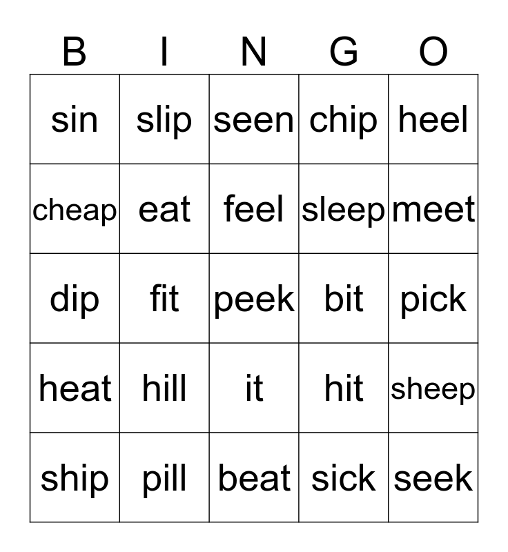 This bingo card has 30 words: pill, peel, fit, feet, sin, seen, eat, it, bit, beat, pick, peek, sick, seek, meet, mitt, hit, heat, hill, heel, dip, deep, slip, sleep, cheap, chip, sheep, ship, feel and fill.