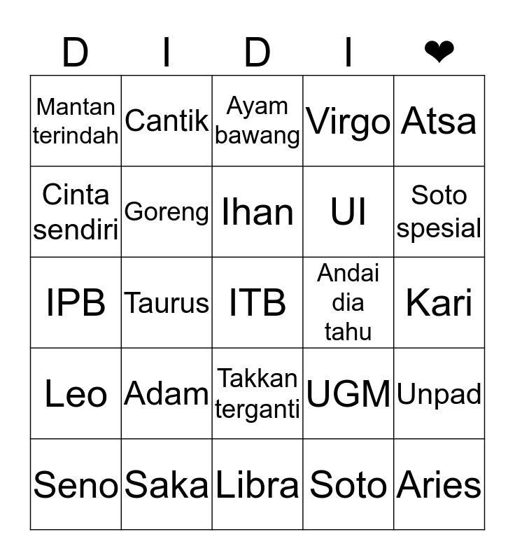 This bingo card has a free space and 24 words: Adam, Saka, Ihan, Seno, Atsa, Mantan terindah, Cinta sendiri, Cantik, Andai dia tahu, Takkan terganti, UI, IPB, UGM, Unpad, Goreng, Soto, Kari, Ayam bawang, Soto spesial, Taurus, Aries, Leo, Virgo and Libra.