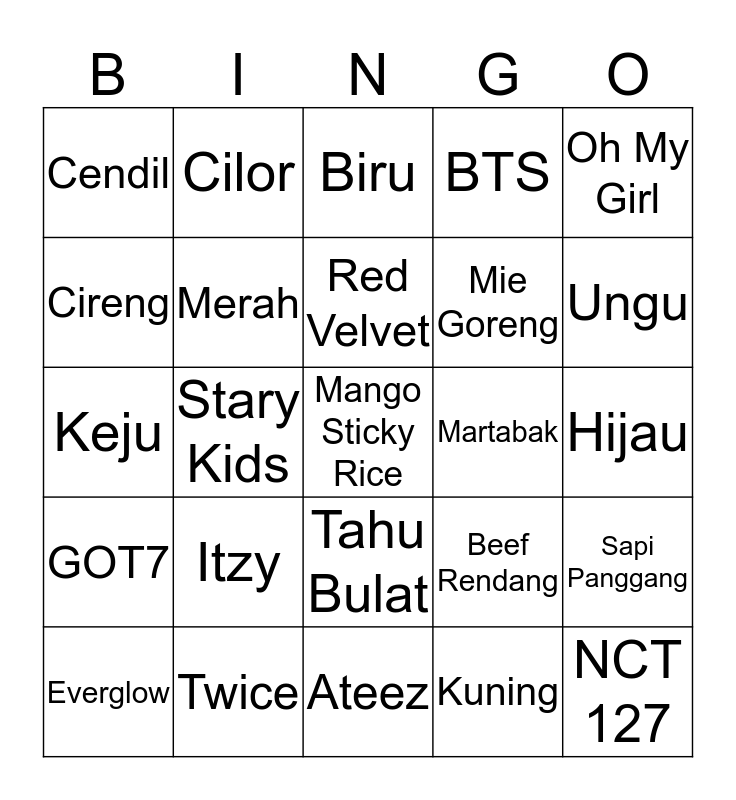 This bingo card has a free space and 24 words: Itzy, Twice, Red Velvet, Everglow, Oh My Girl, Cendil, Cireng, Cilor, Martabak, Tahu Bulat, Mie Goreng, Keju, Beef Rendang, Sapi Panggang, Merah, Kuning, Hijau, Biru, Ungu, Stary Kids, NCT 127, GOT7, BTS and Ateez.