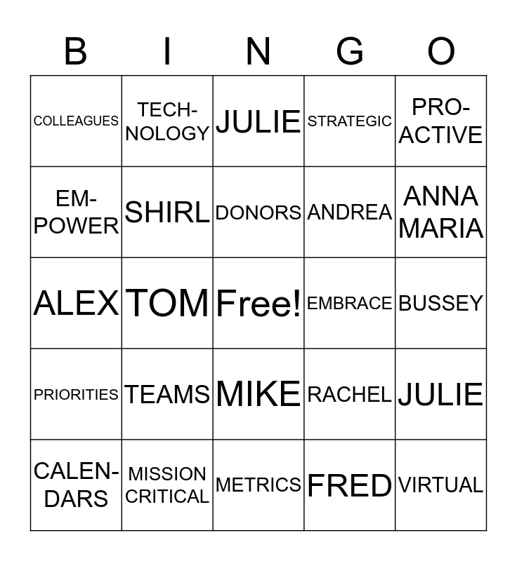 This bingo card has a free space and 24 words: TEAMS, MISSION CRITICAL, DONORS, CALEN-DARS, PRO- ACTIVE, COLLEAGUES, EM- POWER, TECH-NOLOGY, EMBRACE, MIKE, ANDREA, ALEX, RACHEL, JULIE, SHIRL, FRED, BUSSEY, JULIE, ANNA MARIA, TOM, VIRTUAL, PRIORITIES, STRATEGIC and METRICS.