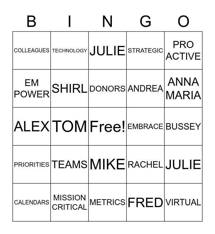 This bingo card has a free space and 24 words: TEAMS, MISSION CRITICAL, DONORS, CALENDARS, PRO ACTIVE, COLLEAGUES, EM POWER, TECHNOLOGY, EMBRACE, MIKE, ANDREA, ALEX, RACHEL, JULIE, SHIRL, FRED, BUSSEY, JULIE, ANNA MARIA, TOM, VIRTUAL, PRIORITIES, STRATEGIC and METRICS.