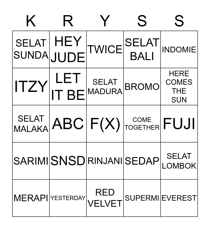 This bingo card has a free space and 24 words: SNSD, YESTERDAY, SELAT MADURA, MERAPI, INDOMIE, SELAT SUNDA, ITZY, HEY JUDE, COME TOGETHER, RINJANI, BROMO, SELAT MALAKA, SEDAP, SELAT LOMBOK, LET IT BE, SUPERMI, FUJI, TWICE, HERE COMES THE SUN, ABC, EVEREST, SARIMI, SELAT BALI and RED VELVET.