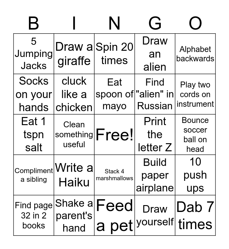 This bingo card has a free space and 24 words: Write a Haiku, Shake a parent's hand, Eat spoon of mayo, Find page 32 in 2 books, Alphabet backwards, 5 Jumping Jacks, Socks on your hands, Draw a giraffe, Print the letter Z, Stack 4 marshmallows, Find "alien" in Russian, Eat 1 tspn salt, Build paper airplane, 10 push ups, cluck like a chicken, Draw yourself, Bounce soccer ball on head, Spin 20 times, Play two cords on instrument, Clean something useful, Dab 7 times, Compliment a sibling, Draw an alien and Feed a pet.