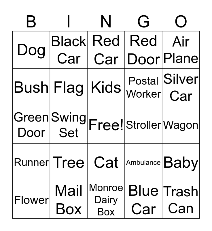 This bingo card has a free space and 29 words: Flower, Bird, Swing Set, Squirrel, Dog, Red Car, Flag, Tree, Stroller, Mail Box, Wagon, Trash Can, Monroe Dairy Box, Blue Car, Silver Car, Bicycle, Cat, Runner, Air Plane, Green Door, Ambulance, Bug, Postal Worker, Bush, Red Door, Black Car, Baby, Kids and Flower Box.