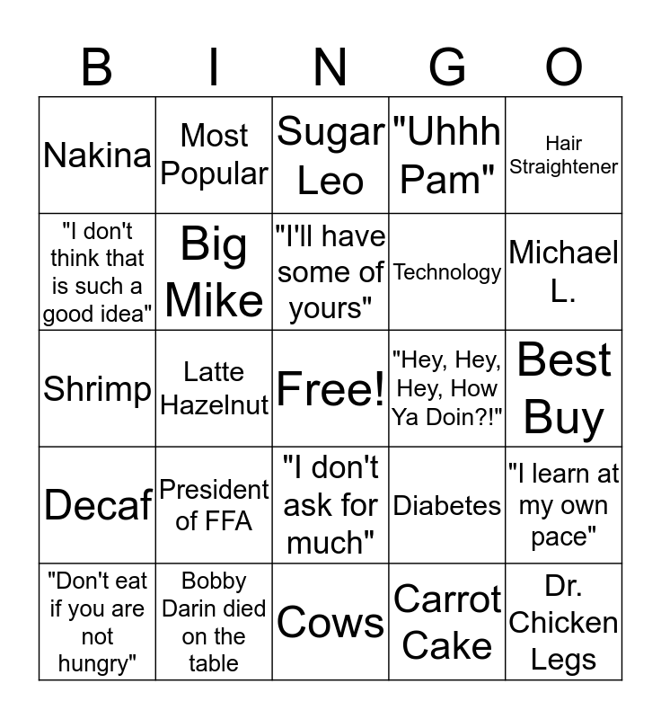 This bingo card has a free space and 35 words: Half a Sandwich, Butter Pecan, Rocking Chair, Big Mike, "I don't ask for much", "Uhhh Pam", "I don't think that is such a good idea", "Just a small amount", "I'll have some of yours", A little late, Shrimp, Hair Straightener, Qualcomm, IBD, Nakina, "Hey, Hey, Hey, How Ya Doin?!", Carrot Cake, Latte Hazelnut, Decaf, Dr. Chicken Legs, Diabetes, "Don't eat if you are not hungry", "I learn at my own pace", Bobby Darin died on the table, Sugar Leo, Michael L., Diet Coke, Baileys, Technology, Best Buy, "Don't sleep with drunks", Cows, President of FFA, Most Popular and Chick Magnet.