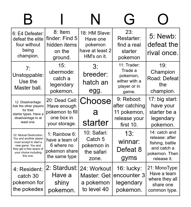 This bingo card has a free space and 24 words: 1: Rainbow 6: have a team of 6 where no pokemon share the same type, 2: Stardust: Have a shiny pokemon., 3: breeder: hatch an egg., 4: Resident: catch 30 pokemon for the pokedex, 5: Newb: defeat the rival once., 6: E4 Defeater: defeat the elite four without being champion., 7: Unstoppable: Use the Master ball., 8: Item finder: Find 5 hidden items on the ground., 9: Reboot: after catching 11 pokemon, release your first 10., 10: Safari: Catch 5 pokemon in the safari zone., 11: Trader: Trade a pokemon, either with a player or in game., 12: Disadvantage: Ask the other players for their starter types. Have a disadvantage to at least one., 13: winnar: Defeat 8 gyms, 14: catch and release: after fishing, battle and catch a pokemon. Then release it., 15: ubermode: catch a legendary pokemon., 16: lucky: encounter 3 legendary pokemon., 17: big start: have your starter be a legendary pokemon., 18: HM Slave: Have one pokemon have at least 2 HM's on it., 19: Champion Road: Defeat the champion., 20: Dead Cell: Have enough pokemon to fill one box in your storage., 21: MonoType: Have a team where they all share one common type., 22: Mutual Destruction: You and another player must accept to start a new game. You and they get a free space of your choice including this one., 23: Restarter: find a real starter pokemon and 24: Workout Master: Get a pokemon to level 40.
