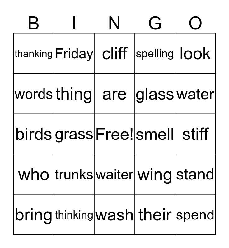 This bingo card has a free space and 29 words: bring, plants, grass, drink, thanking, cliff, thing, trunks, smell, thinking, stiff, spend, wash, their, water, cycle, waiter, who, look, birds, wing, cat, glass, words, spelling, Friday, stand, are and the.
