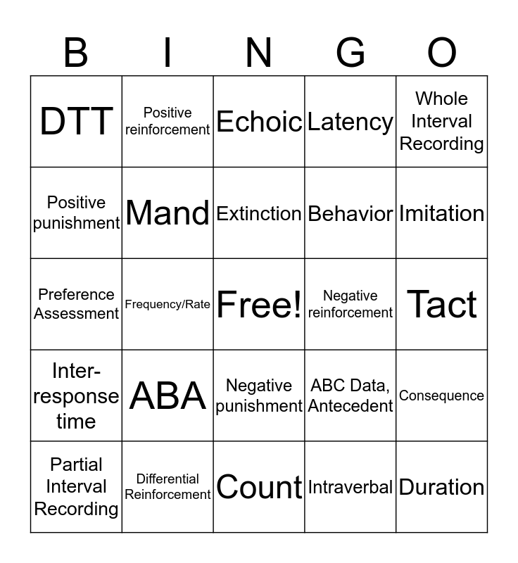 This bingo card has a free space and 24 words: ABA, Differential Reinforcement, Extinction, Partial Interval Recording, Whole Interval Recording, DTT, Positive punishment, Positive reinforcement, Negative reinforcement, Negative punishment, Behavior, Preference Assessment, ABC Data, Antecedent, Consequence, Mand, Intraverbal, Tact, Echoic, Imitation, Frequency/Rate, Duration, Inter-response time, Latency and Count.