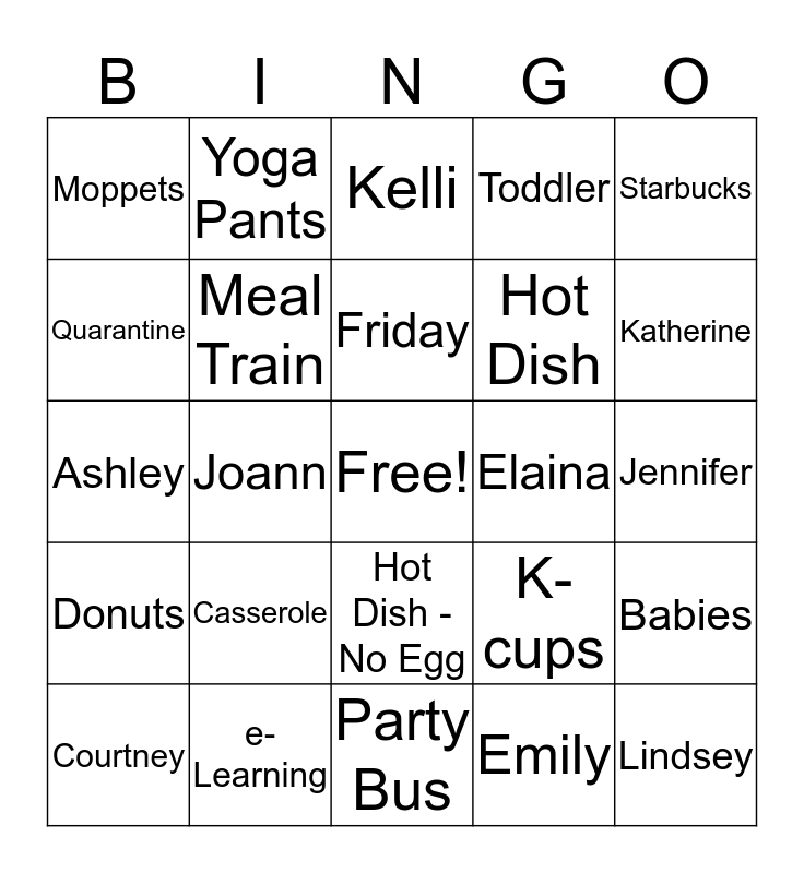 This bingo card has a free space and 24 words: Casserole, e-Learning, Friday, Courtney, Starbucks, Moppets, Quarantine, Yoga Pants, Elaina, Hot Dish - No Egg, Hot Dish, Ashley, K-cups, Babies, Meal Train, Emily, Jennifer, Kelli, Katherine, Joann, Lindsey, Donuts, Toddler and Party Bus.