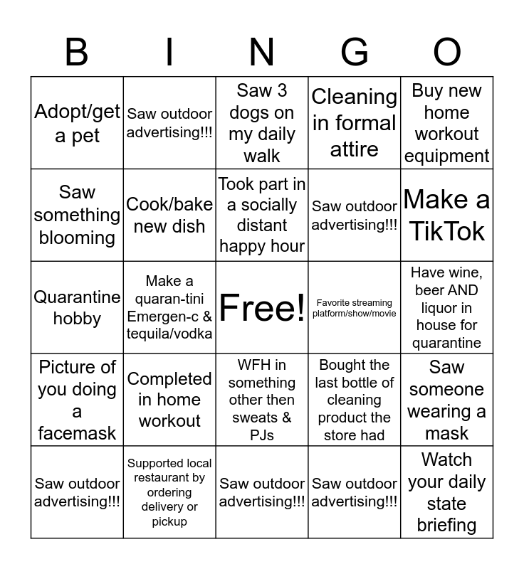 This bingo card has a free space and 24 words: Completed in home workout, Supported local restaurant by ordering delivery or pickup, Took part in a socially distant happy hour, Saw outdoor advertising!!!, Buy new home workout equipment, Adopt/get a pet, Saw something blooming, Saw outdoor advertising!!!, Favorite streaming platform/show/movie, WFH in something other then sweats & PJs, Saw outdoor advertising!!!, Quarantine hobby, Bought the last bottle of cleaning product the store had, Saw someone wearing a mask, Cook/bake new dish, Saw outdoor advertising!!!, Have wine, beer AND liquor in house for quarantine, Saw 3 dogs on my daily walk, Make a TikTok, Make a quaran-tini Emergen-c & tequila/vodka, Watch your daily state briefing, Picture of you doing a facemask, Cleaning in formal attire and Saw outdoor advertising!!!.