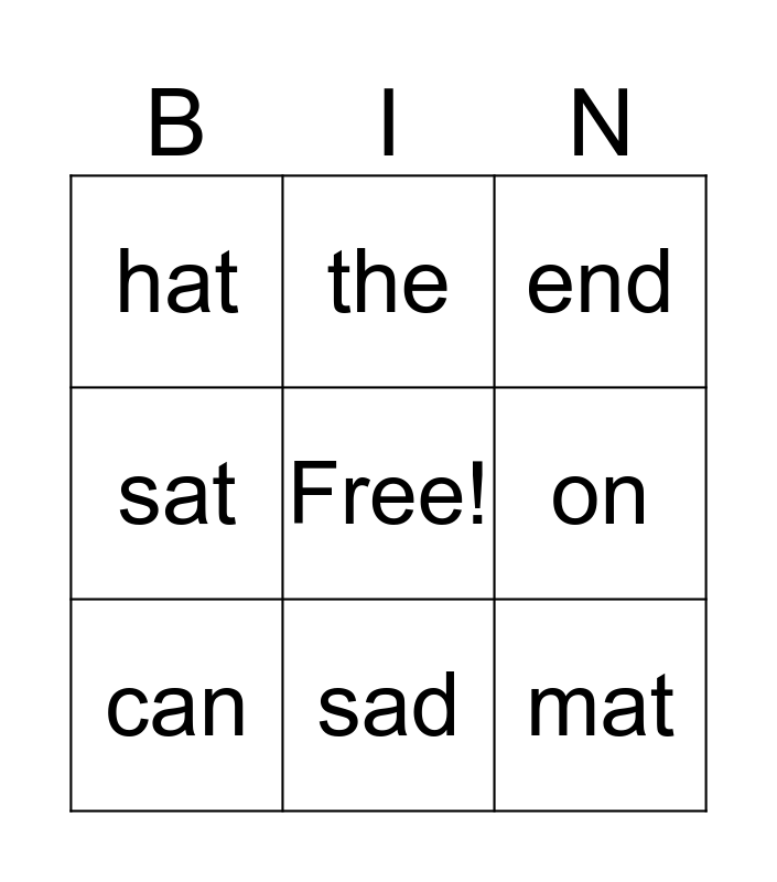 This bingo card has a free space and 13 words: am, at, can, the, sat, mat, and, sam, sad, hat, on, end and cat.