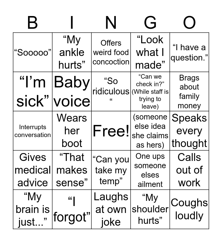 This bingo card has a free space and 24 words: “That makes sense”, “I forgot”, “So ridiculous “, “My brain is just...”, “I have a question.”, “Sooooo”, “I’m sick”, “My ankle hurts”, (someone else idea she claims as hers), “Can you take my temp”, “Can we check in?” (While staff is trying to leave), Interrupts conversation, One ups someone elses ailment, Calls out of work, Baby voice, “My shoulder hurts”, Speaks every thought, Offers weird food concoction, Brags about family money, Wears her boot, Coughs loudly, Gives medical advice, “Look what I made” and Laughs at own joke.