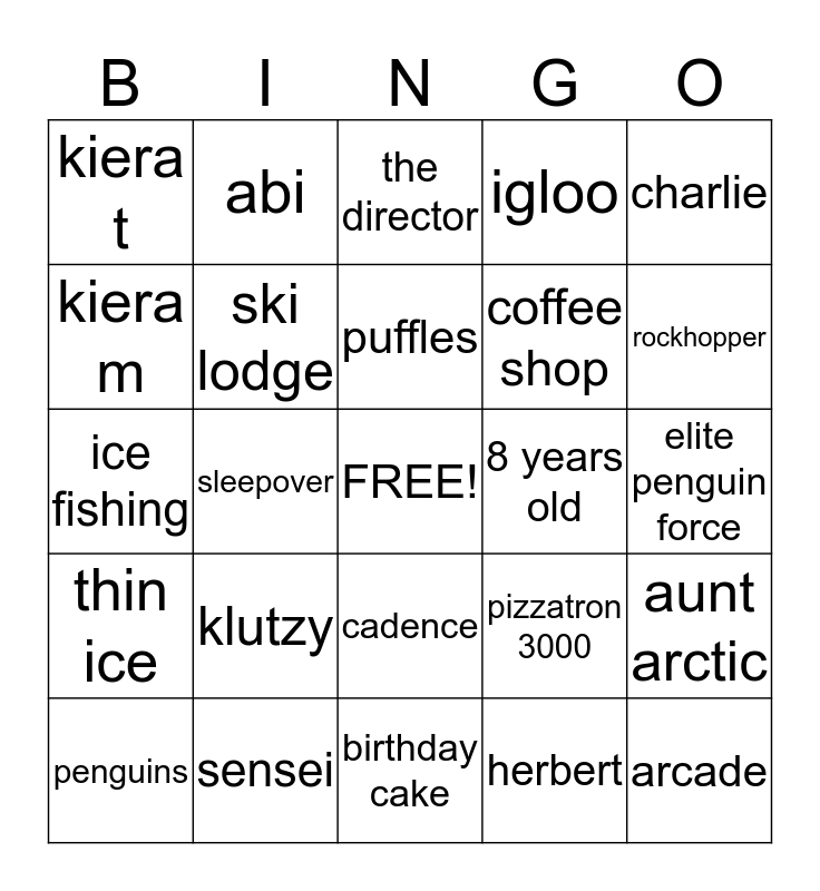 This bingo card has a free space and 24 words: klutzy, sensei, puffles, penguins, charlie, kiera t, kiera m, abi, 8 years old, cadence, coffee shop, ice fishing, pizzatron 3000, aunt arctic, ski lodge, herbert, elite penguin force, the director, rockhopper, sleepover, arcade, thin ice, igloo and birthday cake.