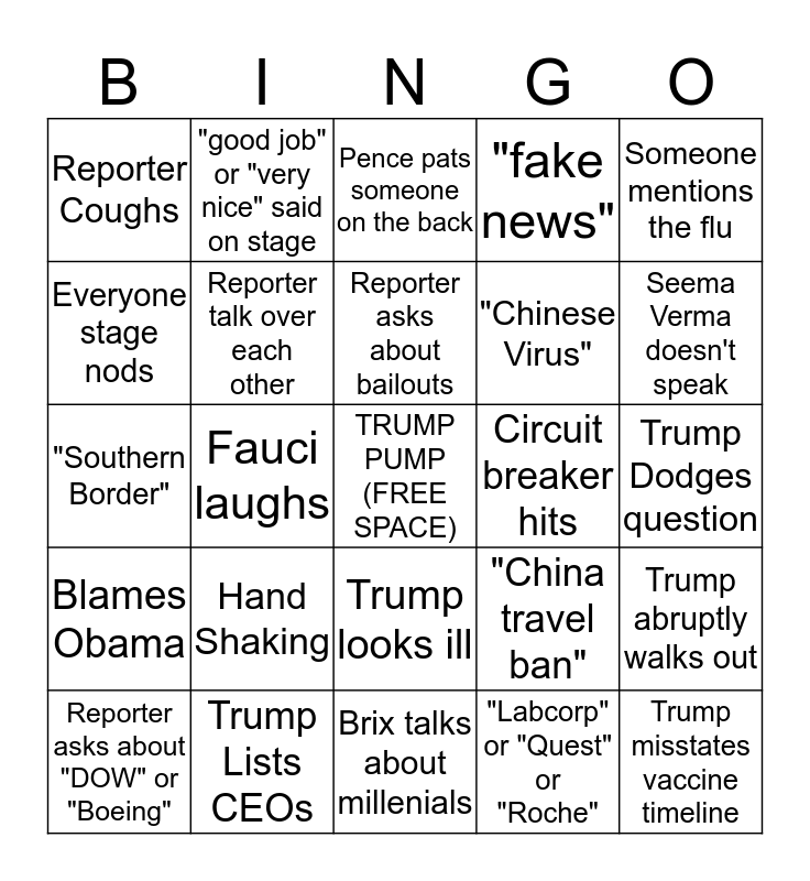 This bingo card has a free space and 24 words: Hand Shaking, Trump Lists CEOs, Reporter asks about bailouts, Reporter asks about "DOW" or "Boeing", Someone mentions the flu, Reporter Coughs, Everyone stage nods, "good job" or "very nice" said on stage, Circuit breaker hits, Trump looks ill, "Chinese Virus", "Southern Border", "China travel ban", Trump abruptly walks out, Reporter talk over each other, "Labcorp" or "Quest" or "Roche", Trump Dodges question, Pence pats someone on the back, Seema Verma doesn't speak, Fauci laughs, Trump misstates vaccine timeline, Blames Obama, "fake news" and Brix talks about millenials.