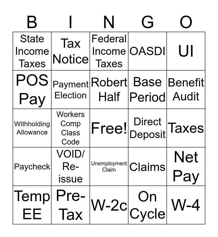 This bingo card has a free space and 70 words: Deductions, Taxes, Benefits, 401K, Pre-Tax, Post Tax, OASDI, Medicare, UI, Gross Wages, Net Pay, Taxable Wages, State Income Taxes, Federal Income Taxes, Workers Comp Premium, Workers Comp Class Code, Unemployment Claim, Base Period, UI Benefits, Paycheck, Direct Deposit, Claims, Benefit Audit, Protest, E-fax, SIDES, Manual Check, Off Cycle, On Cycle, Garnishment, Tax Notice, Workday, Peoplesoft, ADP, Tax Rate, IRS, Canada Revenu Agency, ROE, Service Canada, POS Pay, Bank Reject, VOID/ Re-issue, W-4, W-2, Tax Election, Payment Election, Temp EE, SPS, Corp EE, Tax Levy, Wage Levy, FEIN, SSN, SIN, W-2c, PPA- Prior Period Adj, Robert Half, Protiviti, Specialist, Analysts, Withholding Allowance, Employer Taxes, Employee Taxes, Full Time, Part Time, CTO, CPT, LOA, Terminate and Payroll.