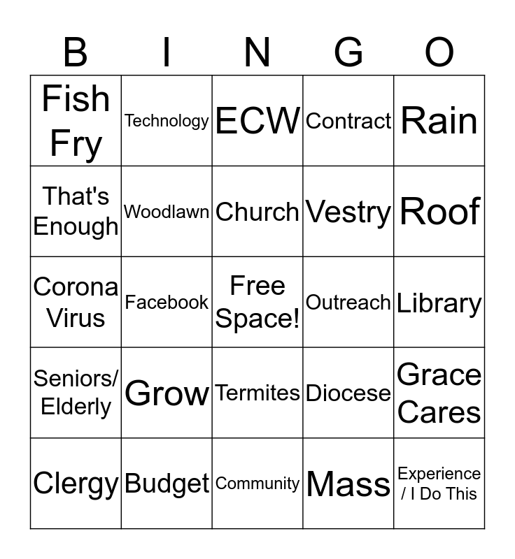 This bingo card has a free space and 24 words: Grow, Budget, Church, Clergy, Rain, Fish Fry, That's Enough, Technology, Outreach, Termites, Vestry, Corona Virus, Diocese, Grace Cares, Woodlawn, Mass, Library, ECW, Roof, Facebook, Experience / I Do This, Seniors/ Elderly, Contract and Community.