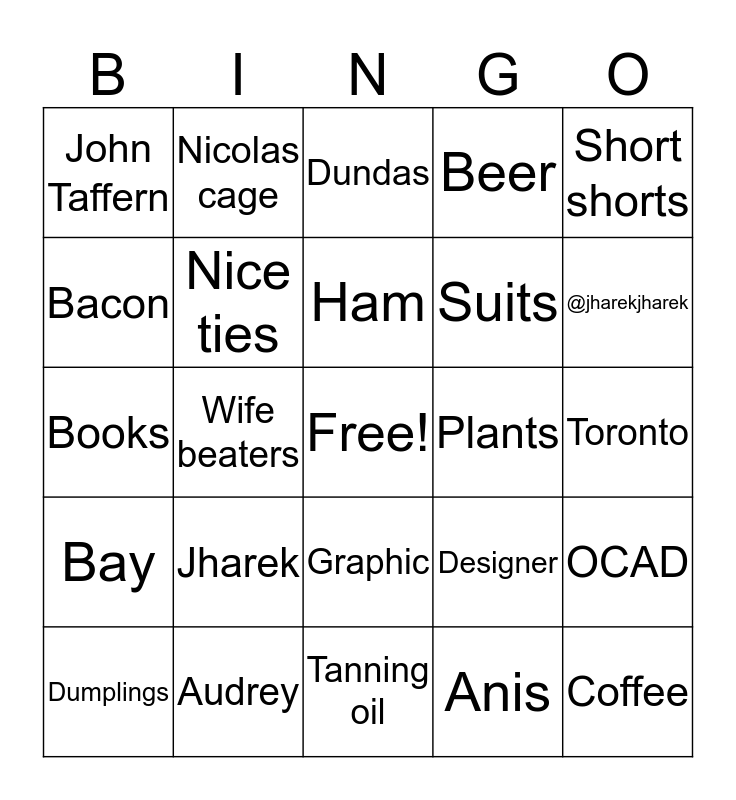 This bingo card has a free space and 24 words: Jharek, Audrey, Ham, Dumplings, Short shorts, John Taffern, Bacon, Nicolas cage, Plants, Graphic, Suits, Books, Designer, OCAD, Nice ties, Anis, Toronto, Dundas, @jharekjharek, Wife beaters, Coffee, Bay, Beer and Tanning oil.