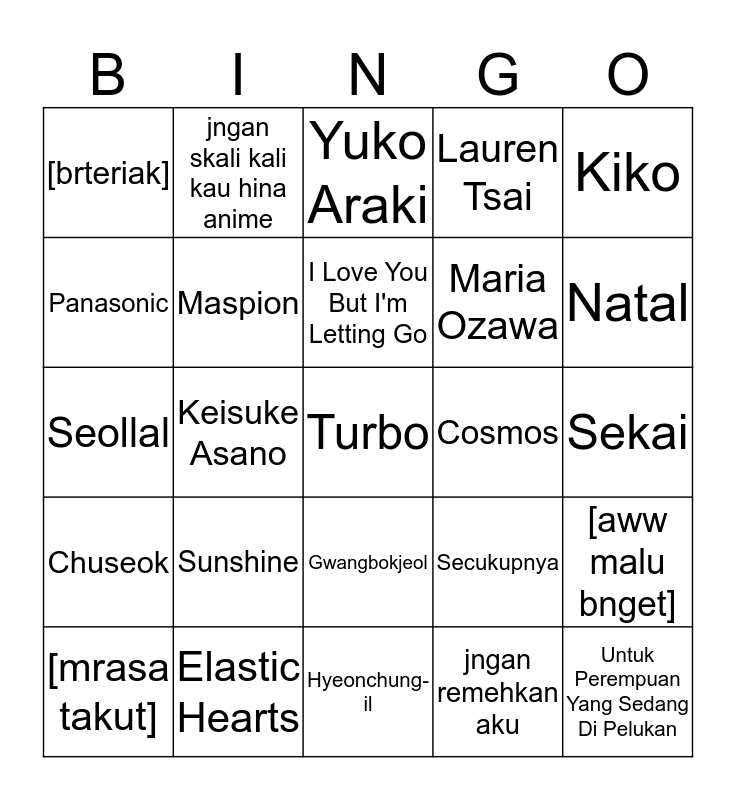 This bingo card has 25 words: Sunshine, Hyeonchung-il, I Love You But I'm Letting Go, [mrasa takut], Kiko, [brteriak], Panasonic, jngan skali kali kau hina anime, Cosmos, Gwangbokjeol, Maria Ozawa, Seollal, Secukupnya, [aww malu bnget], Maspion, Untuk Perempuan Yang Sedang Di Pelukan, Sekai, Yuko Araki, Natal, Keisuke Asano, Turbo, Elastic Hearts, Chuseok, Lauren Tsai and jngan remehkan aku.