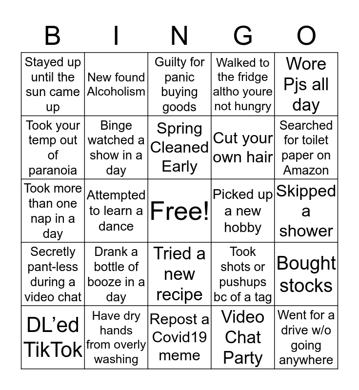 This bingo card has a free space and 24 words: DL’ed TikTok, Drank a bottle of booze in a day, Spring Cleaned Early, Video Chat Party, Wore Pjs all day, Stayed up until the sun came up, New found Alcoholism, Guilty for panic buying goods, Picked up a new hobby, Skipped a shower, Took more than one nap in a day, Binge watched a show in a day, Took shots or pushups bc of a tag, Bought stocks, Took your temp out of paranoia, Have dry hands from overly washing, Repost a Covid19 meme, Walked to the fridge altho youre not hungry, Searched for toilet paper on Amazon, Secretly pant-less during a video chat, Attempted to learn a dance, Tried a new recipe, Cut your own hair and Went for a drive w/o going anywhere.