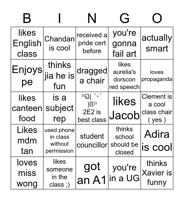 This bingo card has a free space and 24 words: loves miss wong, used phone in class without permission, dragged a chair, you're in a UG, actually smart, likes English class, Chandan is cool, received a pride cert before, likes Jacob, Clement is a cool class chair ( yes ), likes canteen food, thinks jia he is fun, thinks school should be closed, Adira is cool, Enjoys pe, likes someone in the class ;), got an A1, you're gonna fail art, loves propaganda, Likes mdm tan, is a subject rep, student councillor, likes aurelia's dorscon red speech and thinks Xavier is funny.