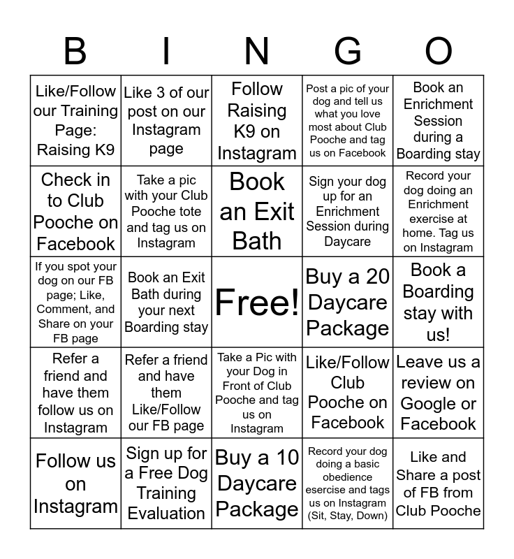 This bingo card has a free space and 24 words: Refer a friend and have them Like/Follow our FB page, Sign up for a Free Dog Training Evaluation, Book an Exit Bath, Follow us on Instagram, Book an Enrichment Session during a Boarding stay, Like/Follow our Training Page: Raising K9, Check in to Club Pooche on Facebook, Like 3 of our post on our Instagram page, Buy a 20 Daycare Package, Take a Pic with your Dog in Front of Club Pooche and tag us on Instagram, Sign your dog up for an Enrichment Session during Daycare, If you spot your dog on our FB page; Like, Comment, and Share on your FB page, Like/Follow Club Pooche on Facebook, Leave us a review on Google or Facebook, Take a pic with your Club Pooche tote and tag us on Instagram, Record your dog doing a basic obedience esercise and tags us on Instagram (Sit, Stay, Down), Book a Boarding stay with us!, Follow Raising K9 on Instagram, Record your dog doing an Enrichment exercise at home. Tag us on Instagram, Book an Exit Bath during your next Boarding stay, Like and Share a post of FB from Club Pooche, Refer a friend and have them follow us on Instagram, Post a pic of your dog and tell us what you love most about Club Pooche and tag us on Facebook and Buy a 10 Daycare Package.