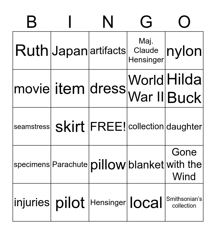 This bingo card has a free space and 24 words: Parachute, pilot, dress, injuries, nylon, Ruth, movie, Japan, collection, pillow, World War II, seamstress, blanket, Gone with the Wind, item, local, daughter, artifacts, Hilda Buck, skirt, Smithsonian’s collection, specimens, Maj. Claude Hensinger and Hensinger.