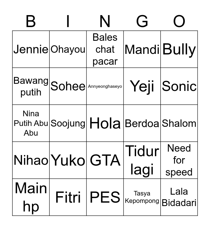 This bingo card has a free space and 24 words: Yuko, Fitri, Annyeonghaseyo, Main hp, Bully, Jennie, Bawang putih, Ohayou, Berdoa, GTA, Yeji, Nina Putih Abu Abu, Tidur lagi, Need for speed, Sohee, Tasya Kepompong, Shalom, Bales chat pacar, Sonic, Soojung, Lala Bidadari, Nihao, Mandi and PES.