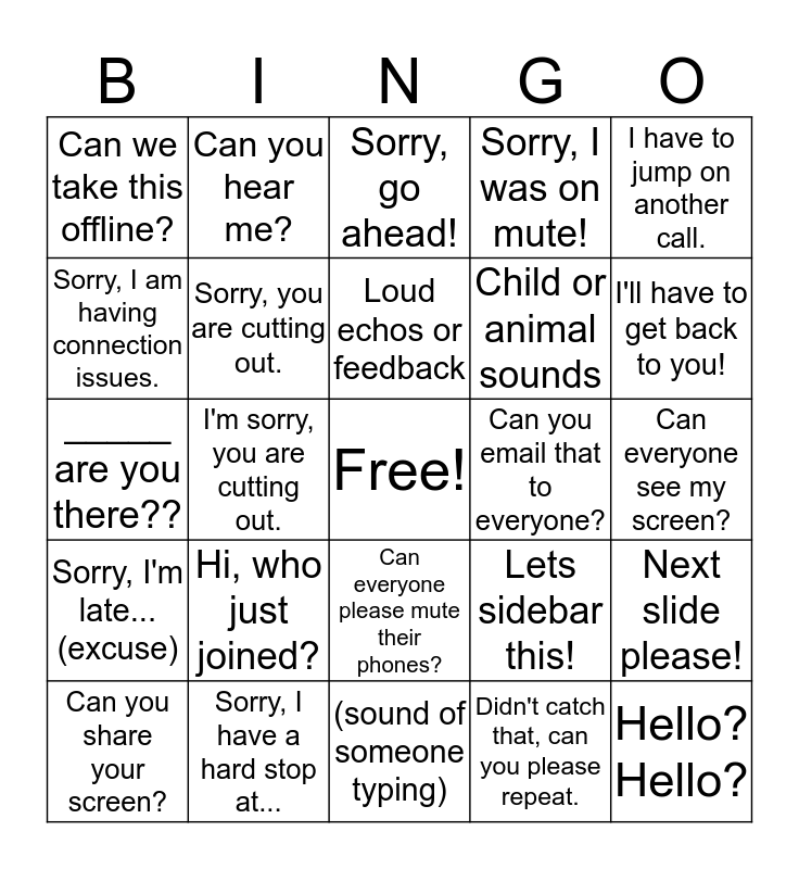 This bingo card has a free space and 24 words: Hi, who just joined?, Sorry, I have a hard stop at..., Loud echos or feedback, Can you share your screen?, I have to jump on another call., Can we take this offline?, Sorry, I am having connection issues., Can you hear me?, Can you email that to everyone?, Can everyone please mute their phones?, Child or animal sounds, _____ are you there??, Lets sidebar this!, Next slide please!, Sorry, you are cutting out., Didn't catch that, can you please repeat., Can everyone see my screen?, Sorry, go ahead!, I'll have to get back to you!, I'm sorry, you are cutting out., Hello? Hello?, Sorry, I'm late... (excuse), Sorry, I was on mute! and (sound of someone typing).