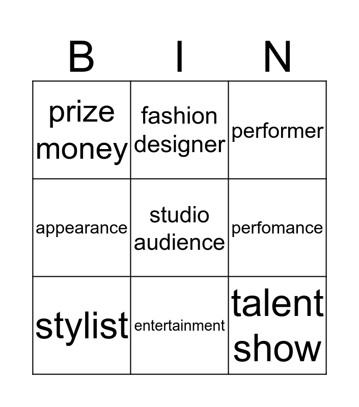 This bingo card has 12 words: Exhibition, talent show, studio audience, perfomance, fashion designer, performer, entertainment, reality TV, prize money, appearance, stylist and media attention.