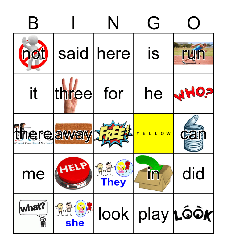 This bingo card has 21 images, a free space and 30 words: come, away, there, is, can, it, in, two, not, three, and, run, am, end, here, will, at, me, to, for, he, did, can, up, look, play, had, get, said and he.