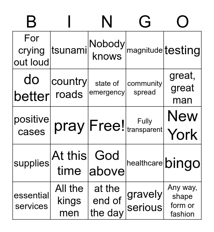 This bingo card has a free space and 44 words: the virus, Any way, shape form or fashion, we've done good stuff, essential services, We're all in this together, gravely serious, Nobody knows, feed our kids, testing, All the kings men, magnitude, Fully transparent, God above, At this time, let me just say this, at the end of the day, red cross, positive cases, a stone unturned, great, great man, tsunami, lots of great stuff, Nobody knows, For crying out loud, Country roads, New York, trump, Statewide day of prayer, healthcare, supplies, grocery stores, bingo, catch a fish, stay home order, pray, restaurants, nursing home, high risk state, state of emergency, do better, community spread, (any type of math equation), country roads and unemployment.