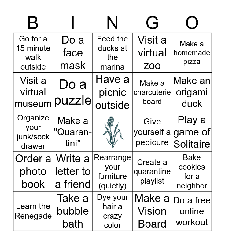 This bingo card has a free space and 24 words: Write a letter to a friend, Take a bubble bath, Have a picnic outside, Learn the Renegade, Make a homemade pizza, Go for a 15 minute walk outside, Visit a virtual museum, Do a face mask, Give yourself a pedicure, Rearrange your furniture (quietly), Make a charcuterie board, Organize your junk/sock drawer, Create a quarantine playlist, Bake cookies for a neighbor, Do a puzzle, Make a Vision Board, Play a game of Solitaire, Feed the ducks at the marina, Make an origami duck, Make a "Quaran-tini", Do a free online workout, Order a photo book, Visit a virtual zoo and Dye your hair a crazy color.