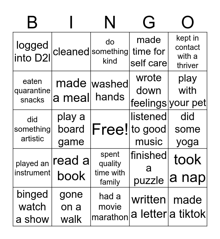 This bingo card has a free space and 24 words: read a book, gone on a walk, washed hands, binged watch a show, kept in contact with a thriver, logged into D2l, eaten quarantine snacks, cleaned, listened to good music, spent quality time with family, wrote down feelings, did something artistic, finished a puzzle, took a nap, made a meal, written a letter, did some yoga, do something kind, play with your pet, play a board game, made a tiktok, played an instrument, made time for self care and had a movie marathon.