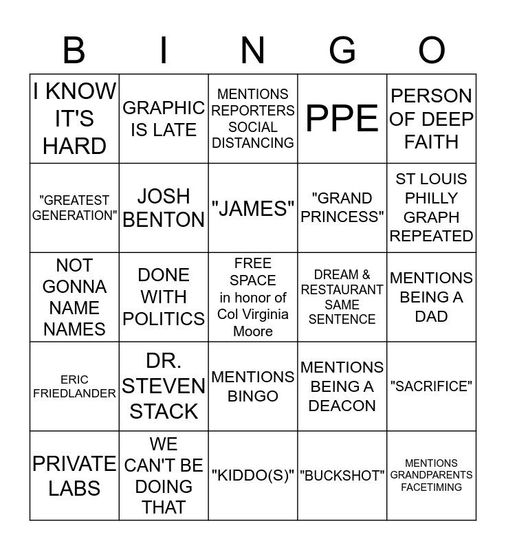 This bingo card has a free space and 33 words: PICKS UP WATER BOTTLE, ANGRY AT GENERAL ASSEMBLY, DONE WITH POLITICS, MENTIONS A DOG, ERIC FRIEDLANDER, JOSH BENTON, PERSON OF DEEP FAITH, PRIVATE LABS, GRAPHIC IS LATE, "PATRIOTIC DUTY", "JAMES", MENTIONS REPORTERS SOCIAL DISTANCING, WE'RE GONNA GET THROUGH THIS, ST LOUIS VS PHILLY GRAPH, DREAM & RESTAURANT SAME SENTENCE, ST LOUIS PHILLY GRAPH REPEATED, WE CAN'T BE DOING THAT, NOT GONNA NAME NAMES, DR. STEVEN STACK, MENTIONS BEING A DEACON, MENTIONS BINGO, "KENNETH", I KNOW IT'S HARD, MENTIONS BEING A DAD, "KIDDO(S)", MENTIONS GRANDPARENTS FACETIMING, PPE, "GRAND PRINCESS", "GREATEST GENERATION", "SACRIFICE", "TEAM KENTUCKY", "BUCKSHOT" and "GOOD NEIGHBOR".