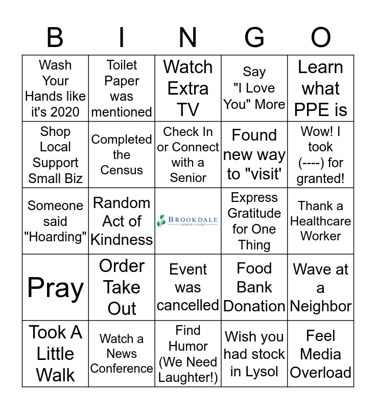 This bingo card has a free space and 24 words: Order Take Out, Watch a News Conference, Check In or Connect with a Senior, Took A Little Walk, Learn what PPE is, Wash Your Hands like it's 2020, Shop Local Support Small Biz, Toilet Paper was mentioned, Express Gratitude for One Thing, Event was cancelled, Found new way to "visit', Someone said "Hoarding", Food Bank Donation, Wave at a Neighbor, Completed the Census, Wish you had stock in Lysol, Thank a Healthcare Worker, Watch Extra TV, Wow! I took (----) for granted!, Random Act of Kindness, Feel Media Overload, Pray, Say "I Love You" More and Find Humor (We Need Laughter!).