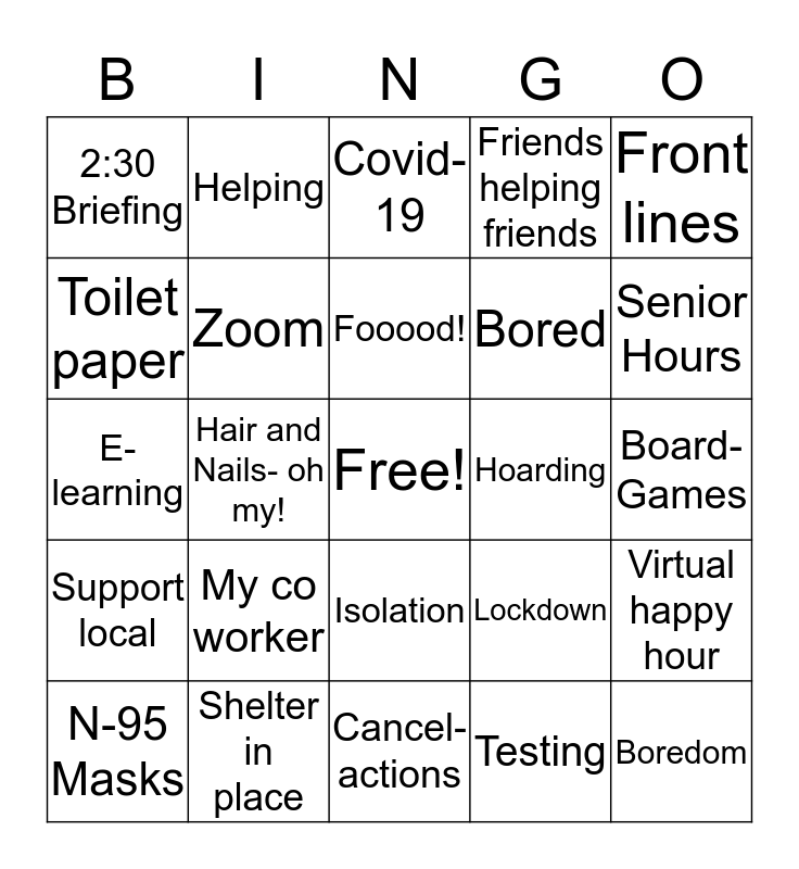 This bingo card has a free space and 24 words: My co worker, Shelter in place, Fooood!, N-95 Masks, Front lines, 2:30 Briefing, Toilet paper, Helping, Hoarding, Isolation, Bored, E-learning, Lockdown, Virtual happy hour, Zoom, Testing, Board- Games, Covid-19, Senior Hours, Hair and Nails- oh my!, Boredom, Support local, Friends helping friends and Cancel-actions.